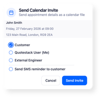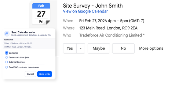 Quotestack supports a “pre-survey quote” approach: the customer receives an estimate, then books a site survey, after which the engineer can revise the quote if needed.