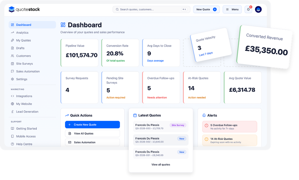 Stop rewriting quotes and chasing missing details. Quotestack automates the quoting journey so you spend less time on admin and more time on surveys, installs, and revenue generating work.