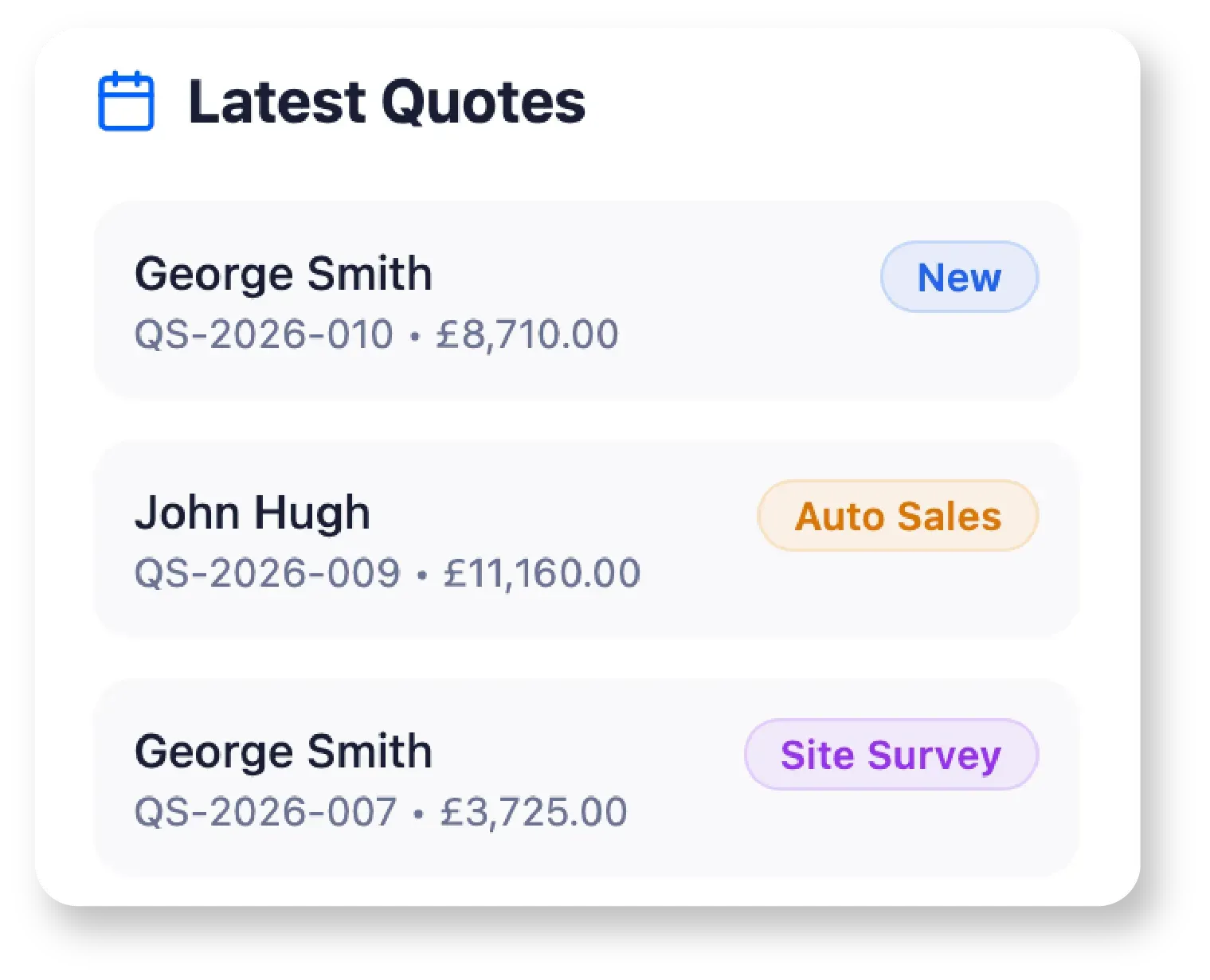 Quotestack supports a “pre-survey quote” approach: the customer receives an estimate, then books a site survey, after which the engineer can revise the quote if needed.