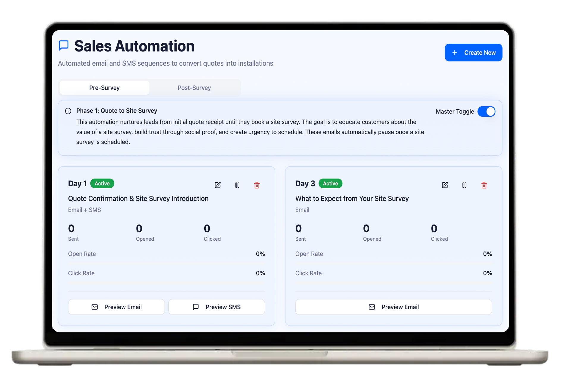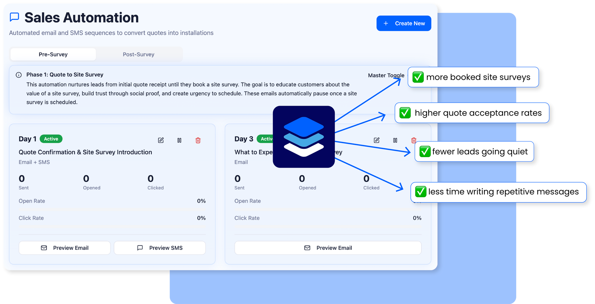 The automation features are incredible. The website widget allows potential customers to start the quoting process 24/7, and the system automatically sends out professional, branded PDFs. ven better, the automated follow-up emails and SMS sequences work like having a tireless sales assistant. We're booking more site surveys from cold leads without us having to make a single call.