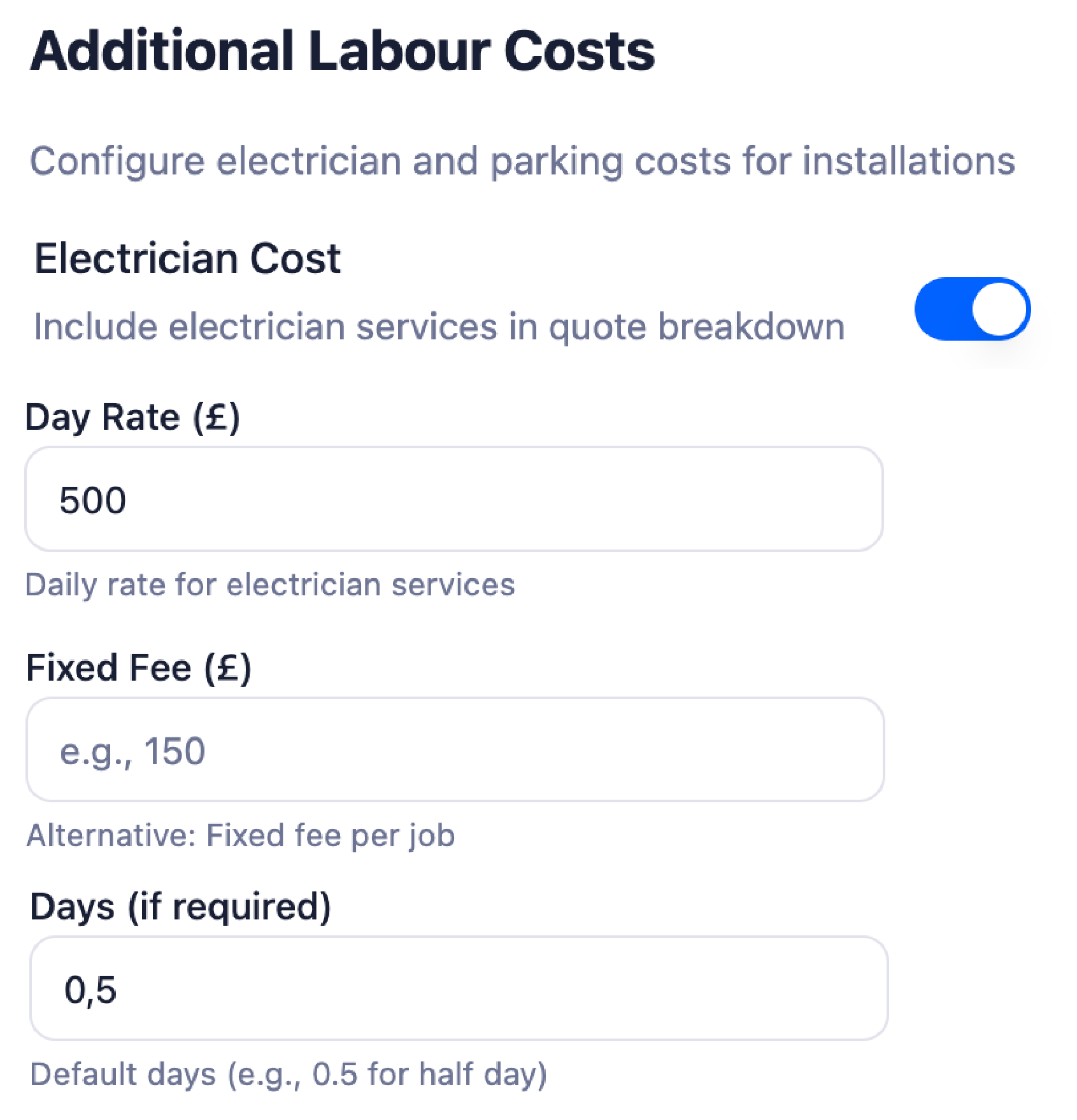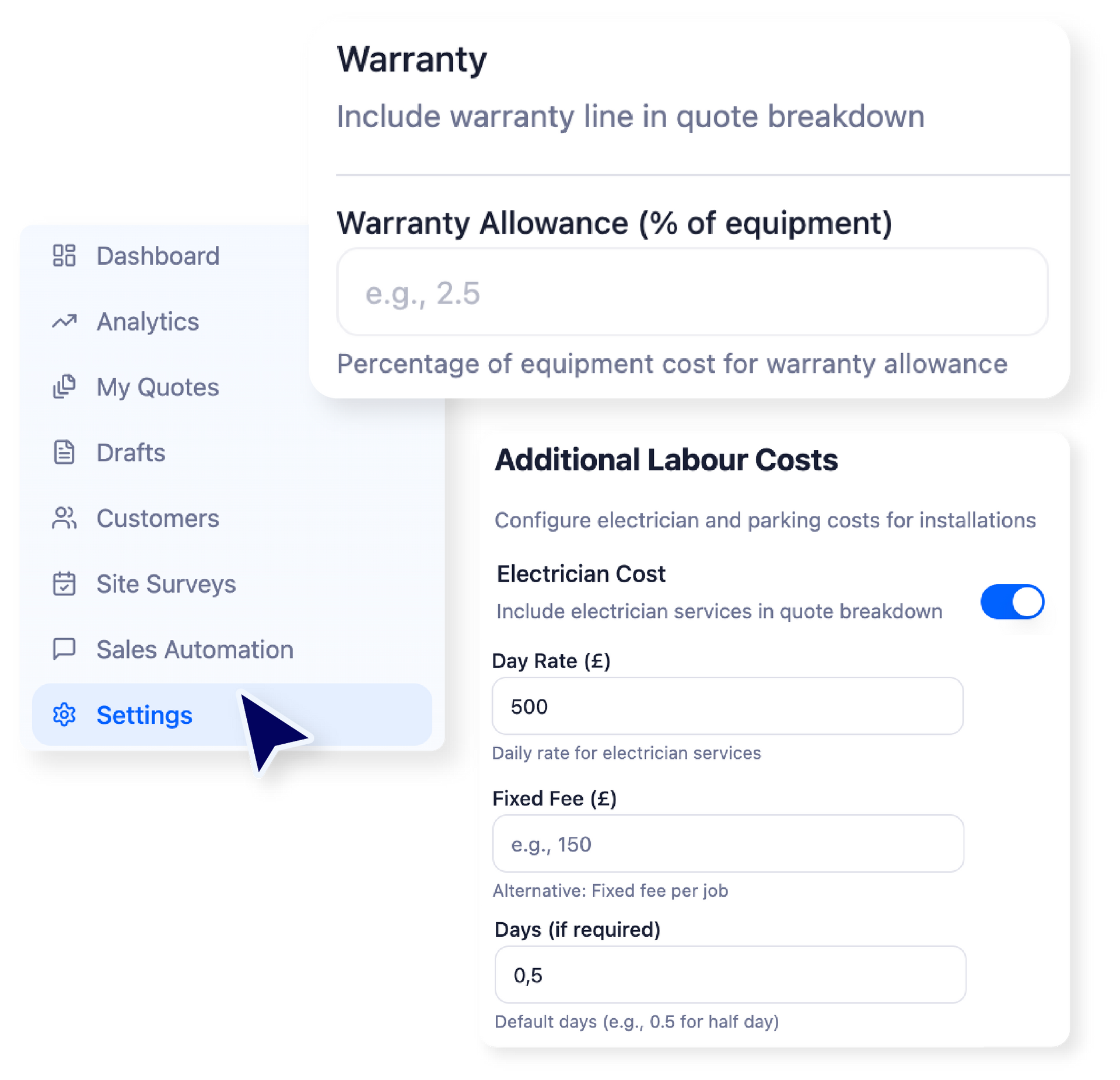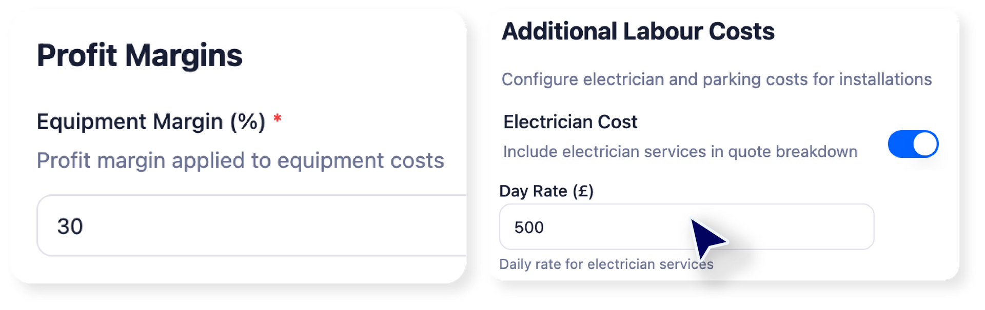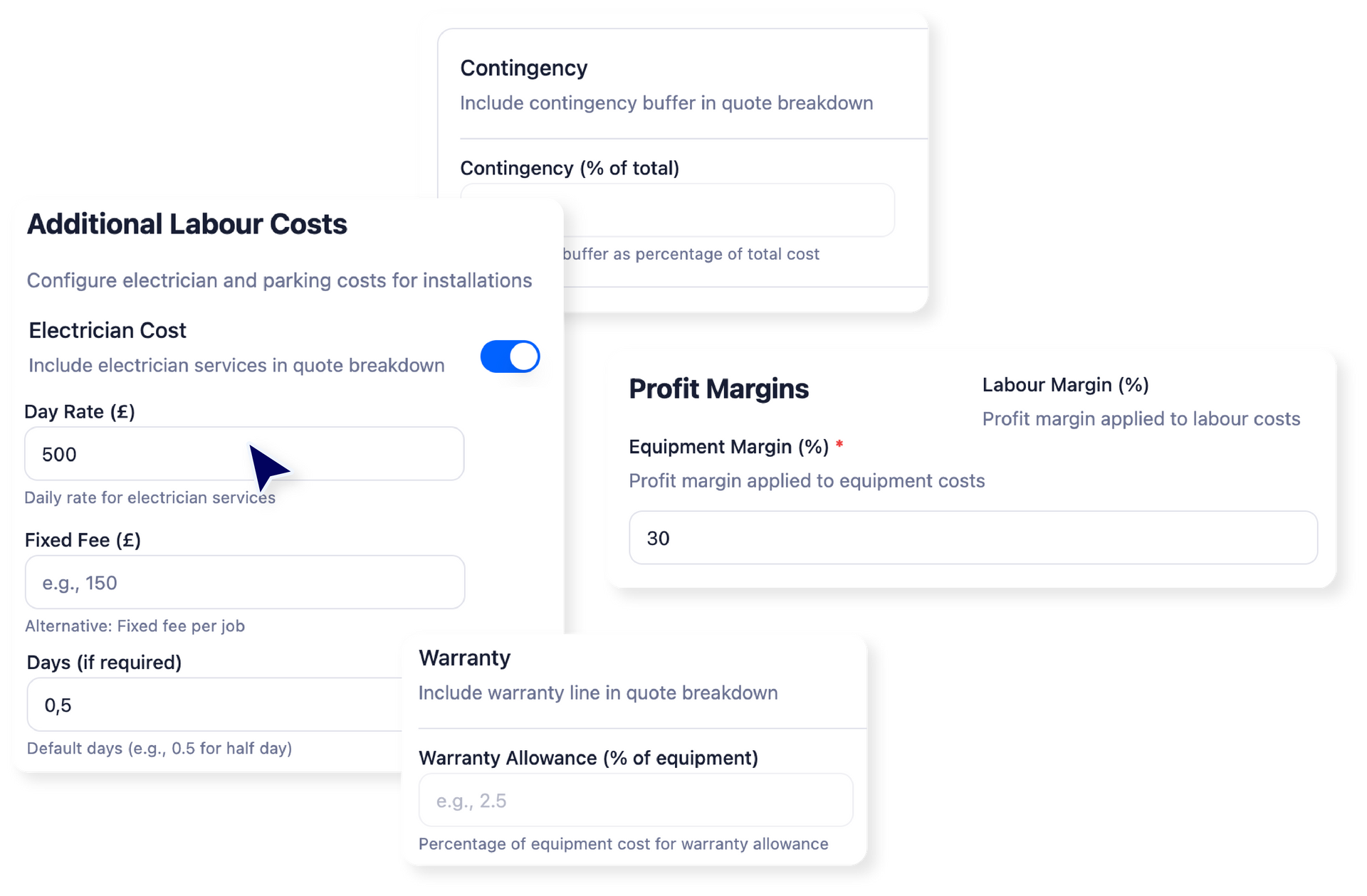 Custom rates turn your pricing into a repeatable model: labour days, margins, allowances, and rules are built into the quote journey.