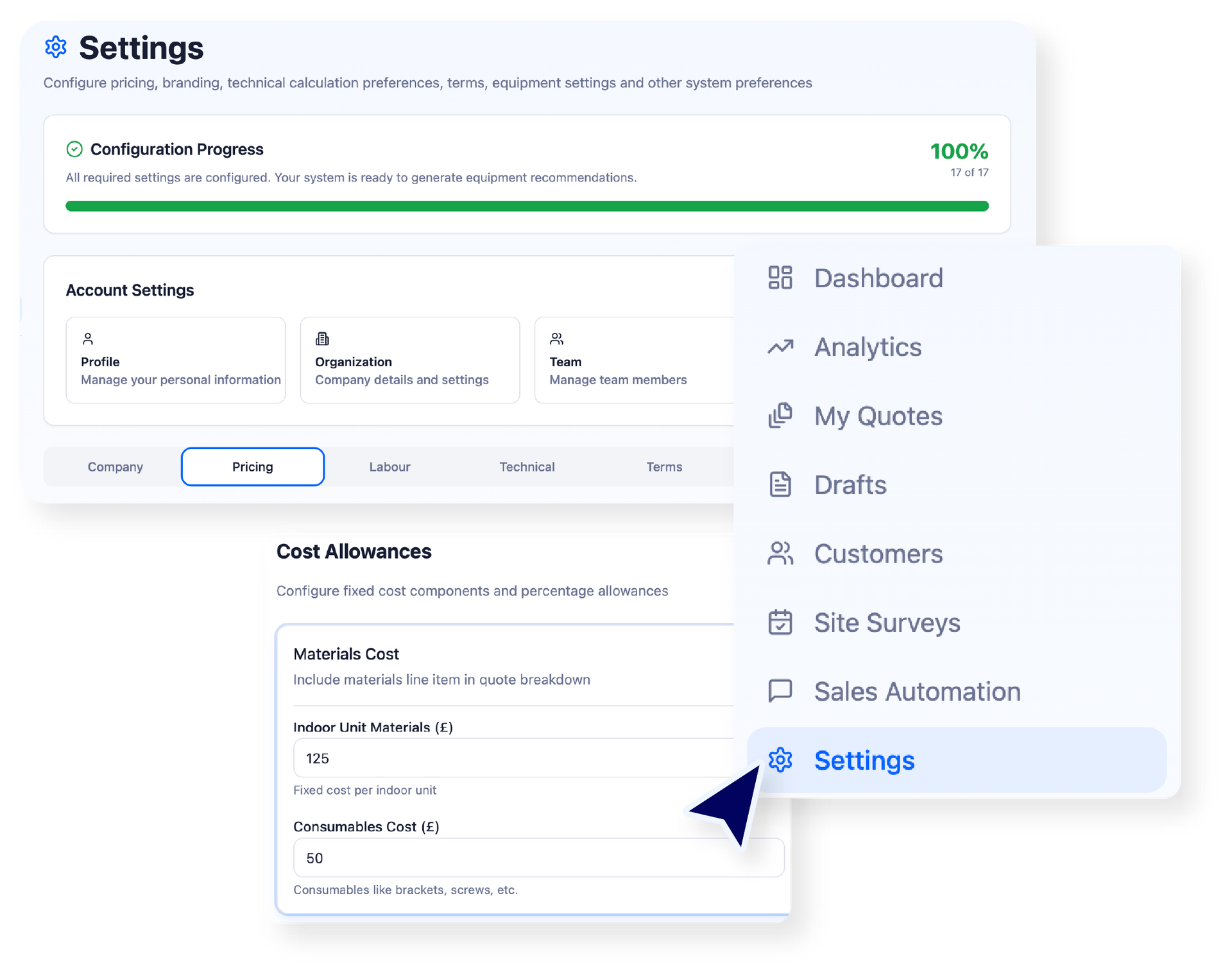 Setup typically includes onboarding plus configuration of your brands, pricing rules, labour day rates, margins, and uploaded equipment catalogues so quotes reflect your business logic.