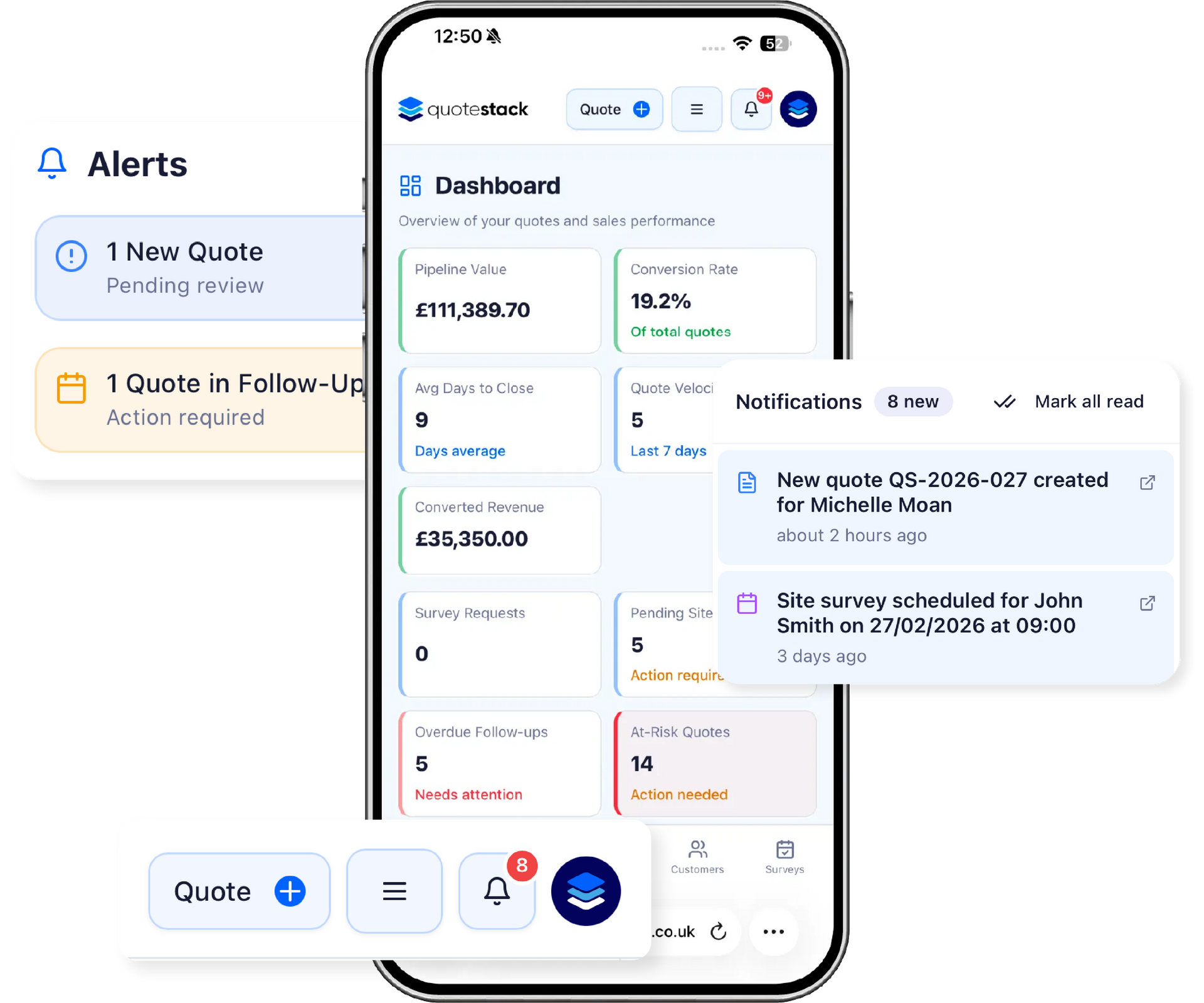 Quotestack supports a “pre-survey quote” approach: the customer receives an estimate, then books a site survey, after which the engineer can revise the quote if needed.