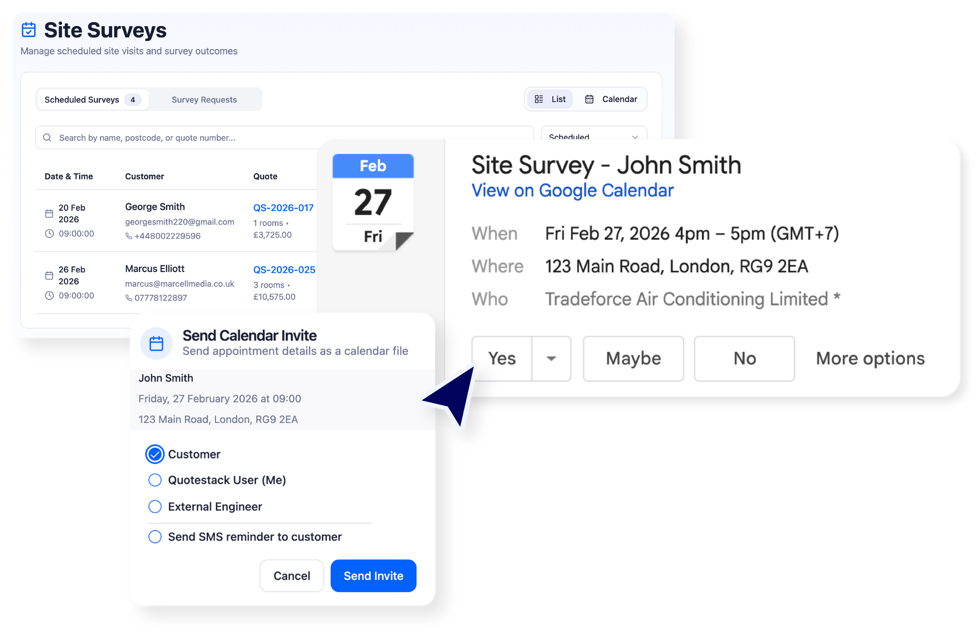 Surveys are the “commitment step”. The more surveys you book, the more jobs you win. Quotestack makes survey booking the natural outcome after a quote is delivered.