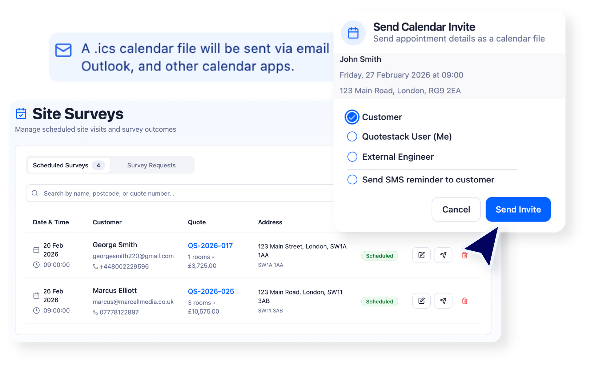 Quotestack supports a “pre-survey quote” approach: the customer receives an estimate, then books a site survey, after which the engineer can revise the quote if needed.