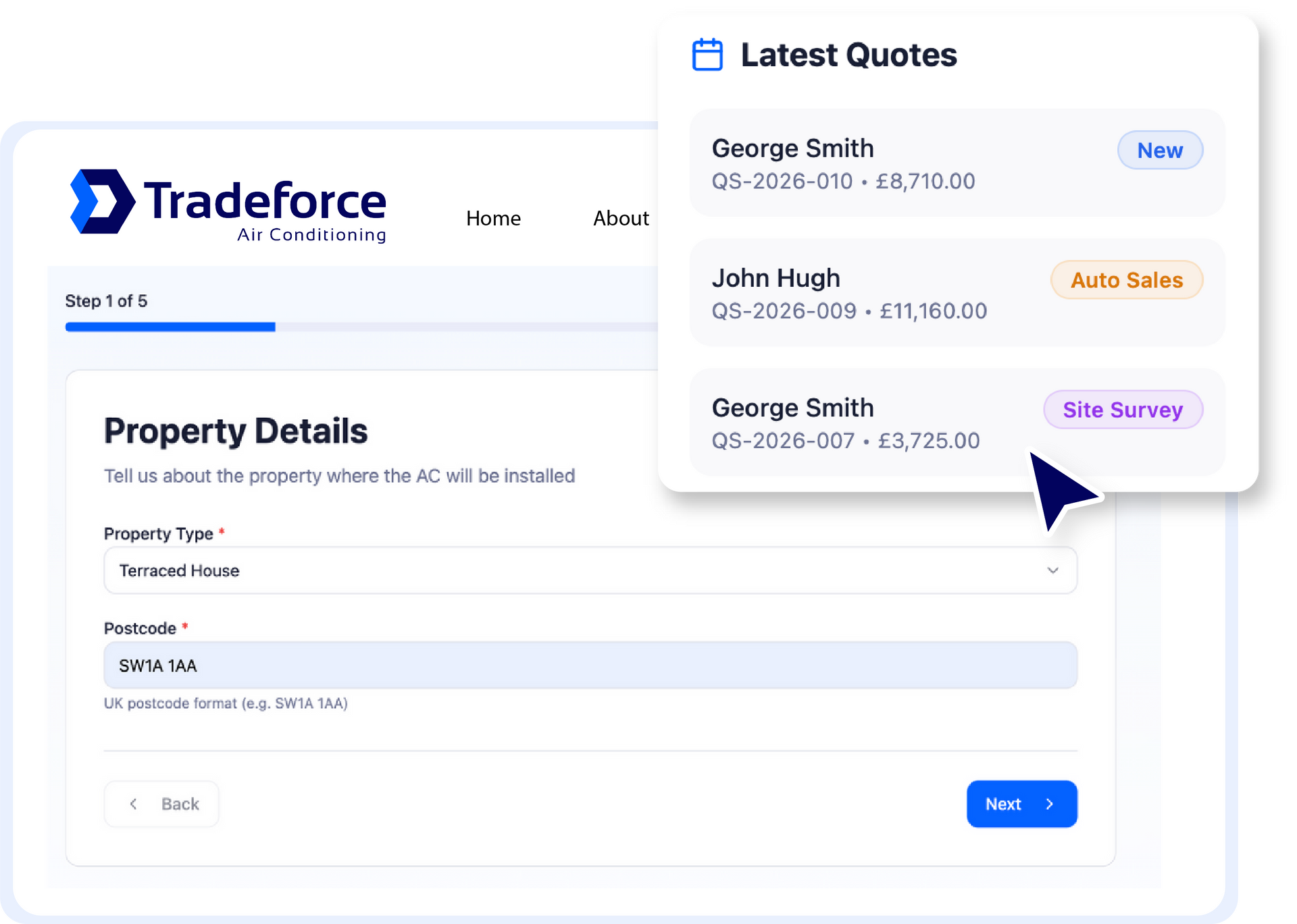 Quotestack supports a “pre-survey quote” approach: the customer receives an estimate, then books a site survey, after which the engineer can revise the quote if needed.