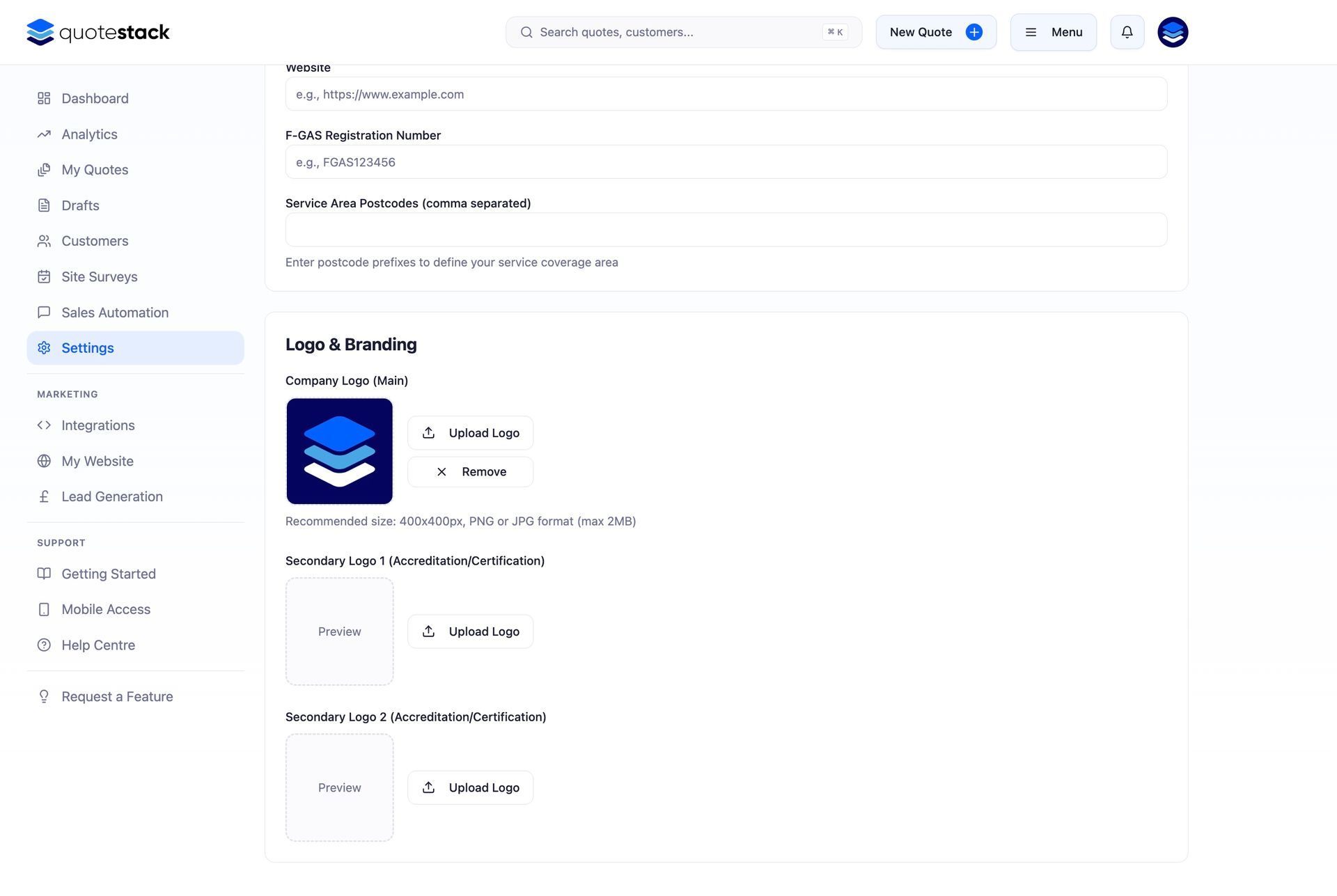 You can upload up to two secondary logos that appear in the footer of your quote PDFs. Use these for manufacturer accreditations, industry certifications (e.g. F-Gas, REFCOM), or partner badges that build customer trust.