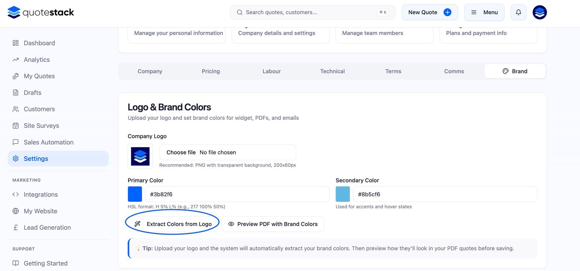 Make Quotestack your own. Upload logos, set brand colours, and control how your quotes look to customers.