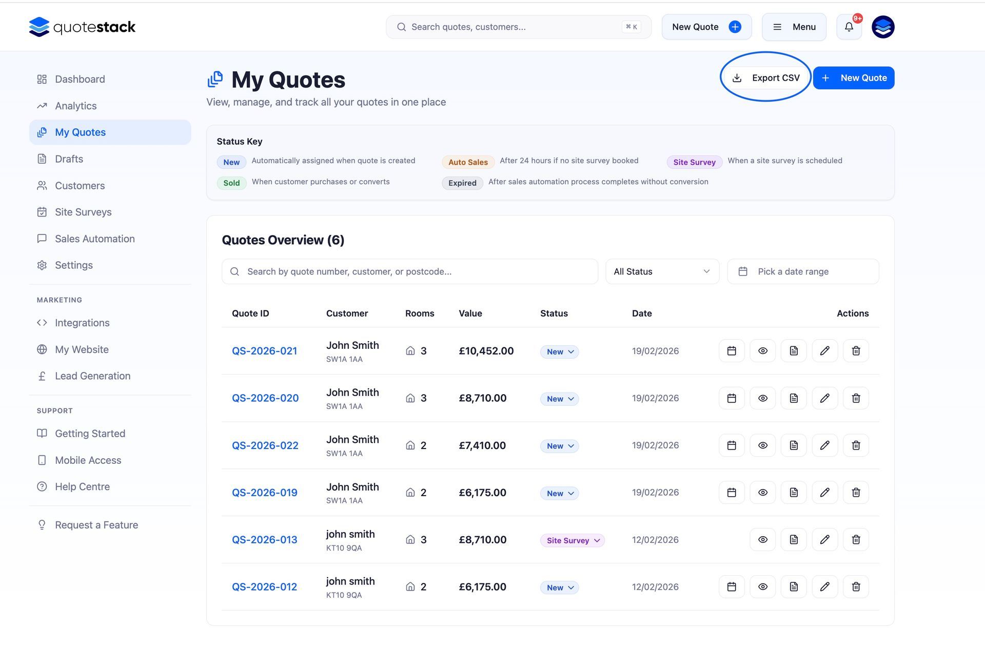 Use the available filters to narrow down the data. For example, filter quotes by date range, status, or source. Only the filtered results will be included in the export.