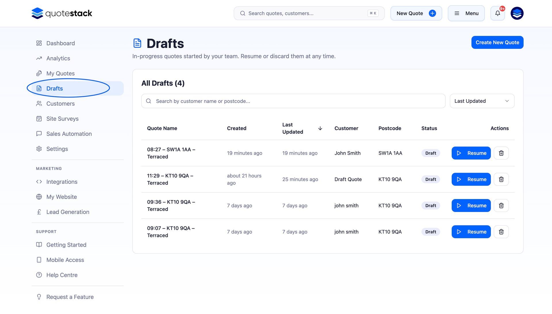 When you start building a quote but haven't finished it yet, it's saved as a Draft. Drafts appear in the Drafts page and can be edited at any time. They don't count toward your pipeline metrics until they're submitted.