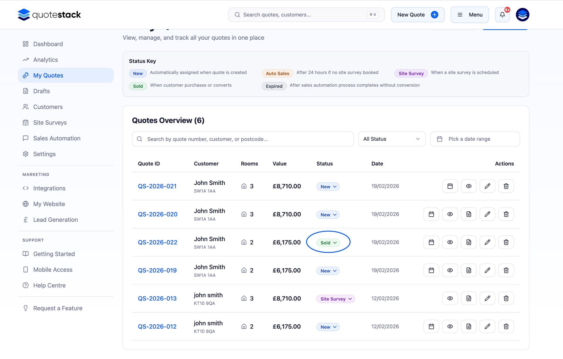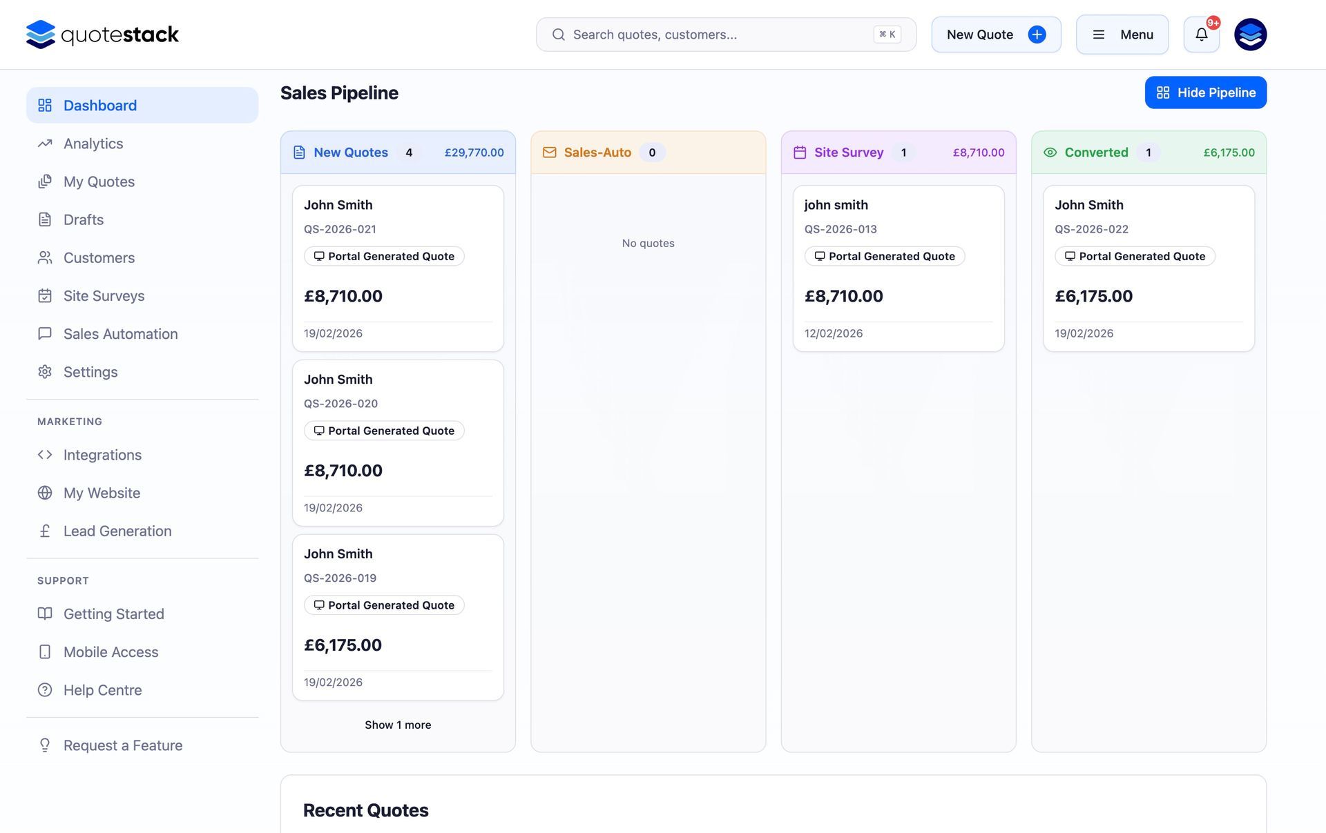 Understanding the quote lifecycle helps you manage your workload effectively. Use the pipeline to prioritise follow-ups, track conversion rates, and ensure no quote gets forgotten.
