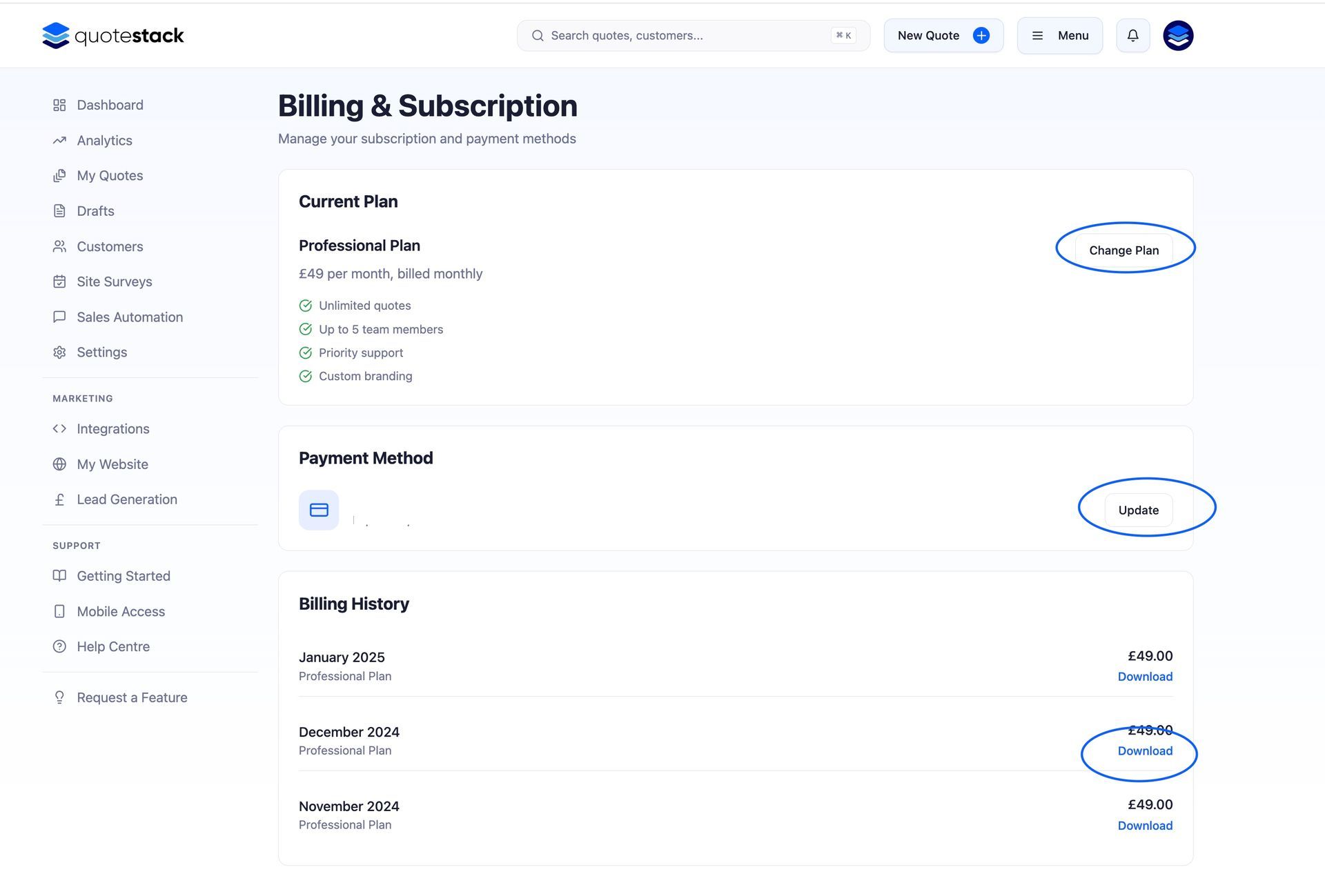 Your Quotestack subscription determines which features and limits are available to your team. This guide covers how to view your current plan, update payment details, and manage your billing.