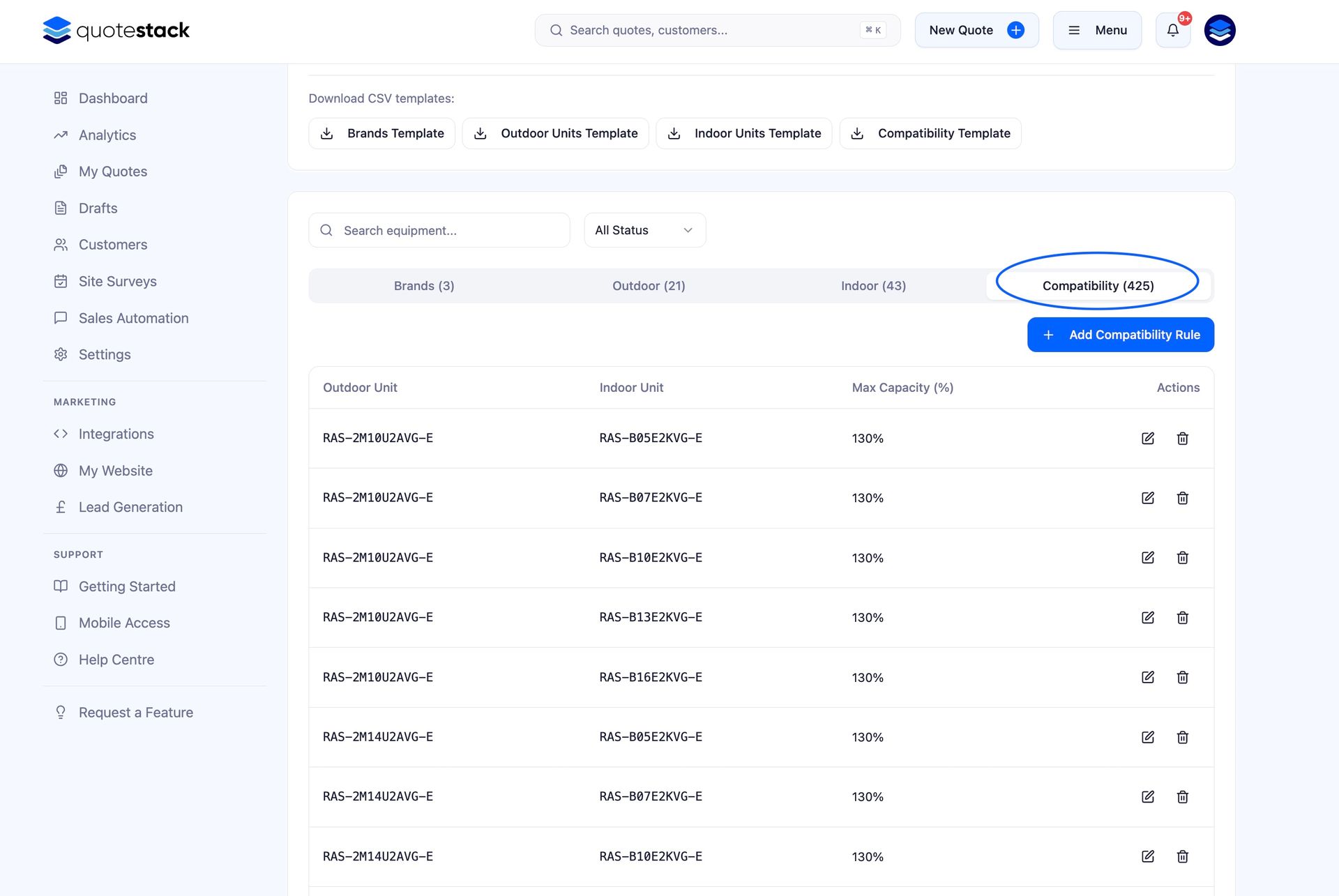 A common mistake is adding new equipment models but forgetting to set up their compatibility rules. The quote builder will skip any units that have no compatible pairings.