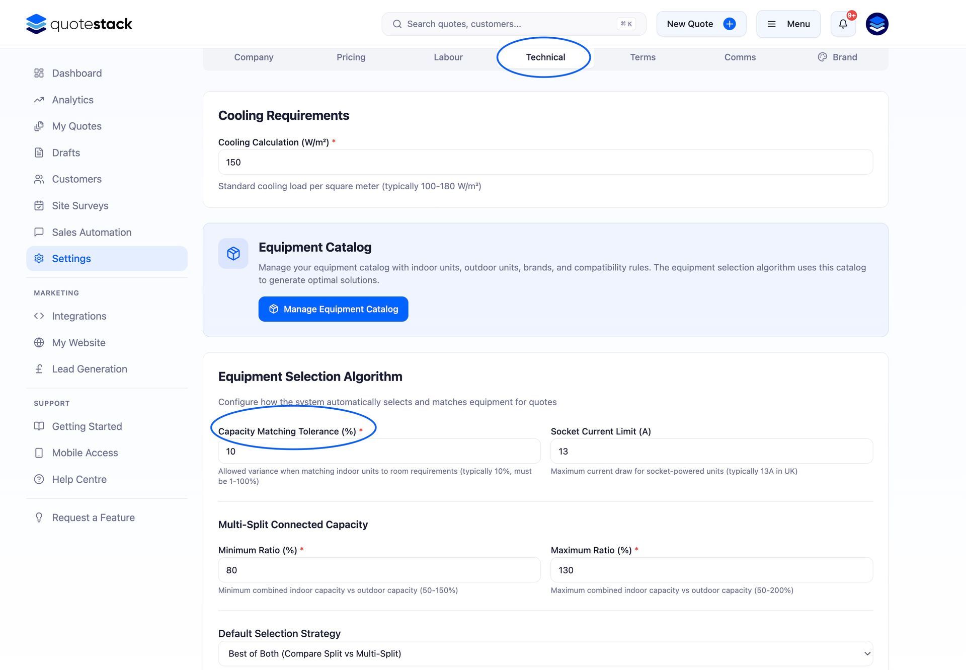 The quote builder selects equipment from your Equipment Catalogue. If the catalogue is empty or incomplete, the system can't generate a valid selection.
